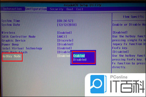 4、还是使用方向键,选择“Hotkey mode”项,按一下“回车键”,把这个选项的状态修改为“Disabled禁用”;