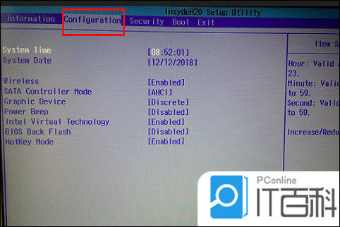 3、接着,在Bios下,使用键盘方向键,移动到“Configuration”选项卡;