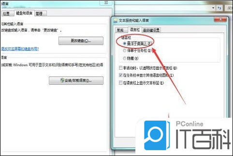 4、点开更改键盘之后会弹出一个输入语言设置框,点开里面的“语言栏”如下图: