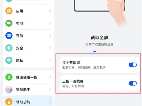 3、打开【三指下滑】、【指关节截屏】右侧的开关。