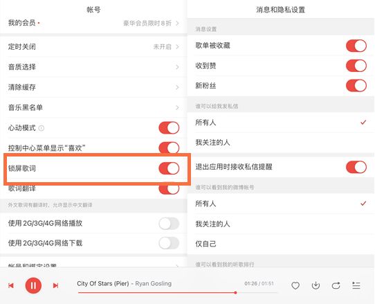 2、点击账号,在账号页面打开锁屏歌词的开关即可。
