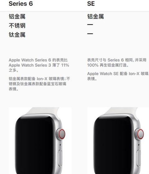 Apple Watch Series 6:采用全天候视网膜显示屏,铝金属表壳,有铝金属表款配备 Ion-X 玻璃表镜;不锈钢及钛金属表款配备蓝宝石玻璃表镜选择。而Apple Watch SE:采用视网膜显示屏,铝金属表壳,配备 Ion-X 玻璃表镜。Apple Watch Series 6显示区域一直延伸到圆角边缘,而且材质和颜色有多种选择。