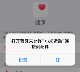 3、接下来会有打开蓝牙允许“小米运动”连接到配件的提示,选择设置,然后打开蓝牙。