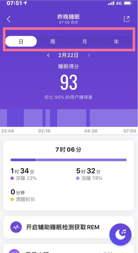 2、进入后即可按日、周、月、年查看睡眠数据。