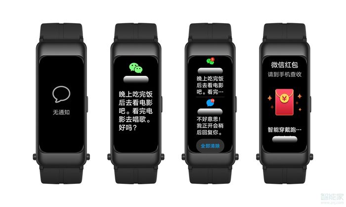 收到多条消息时,可上下滑动浏览内容。当收到微信红包时,手环屏幕显示“红包来了”画面,并振动提醒。点击红包即可进入正常消息界面,但手环无法打开红包,请及时在手机微信中抢红包。