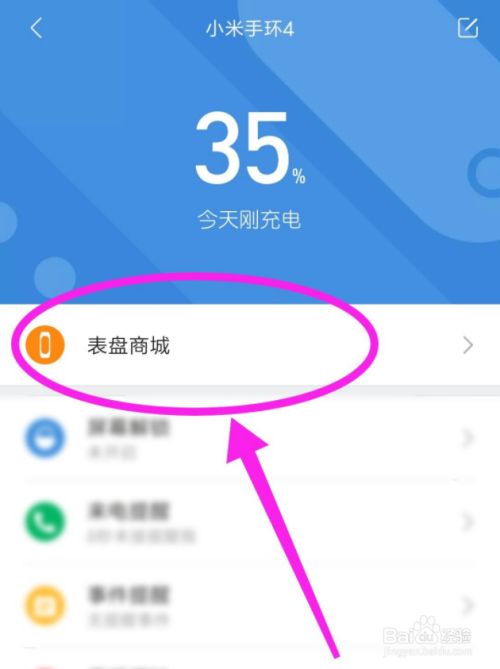 3、第三步:在小米手环4的功能查看页面,向下找到“表盘商城”并点击打开;
