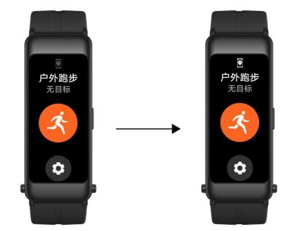 2、相关目标设置完成后,右滑返回进入户外跑步,手环上出现搜星提示,等待 定位 成功后(GPS图标变亮),点击跑步图标进入跑步。(锻炼过程中,亮屏时:上下滑动手环屏幕可以查看 运动 数据详情。点击手环侧按键锻炼暂停,再次点击手环侧按键或点击色图标继续锻炼,点击红色图标停止并查看运动数据。运动过程中,长按手环侧按键,可直接结束运动。)