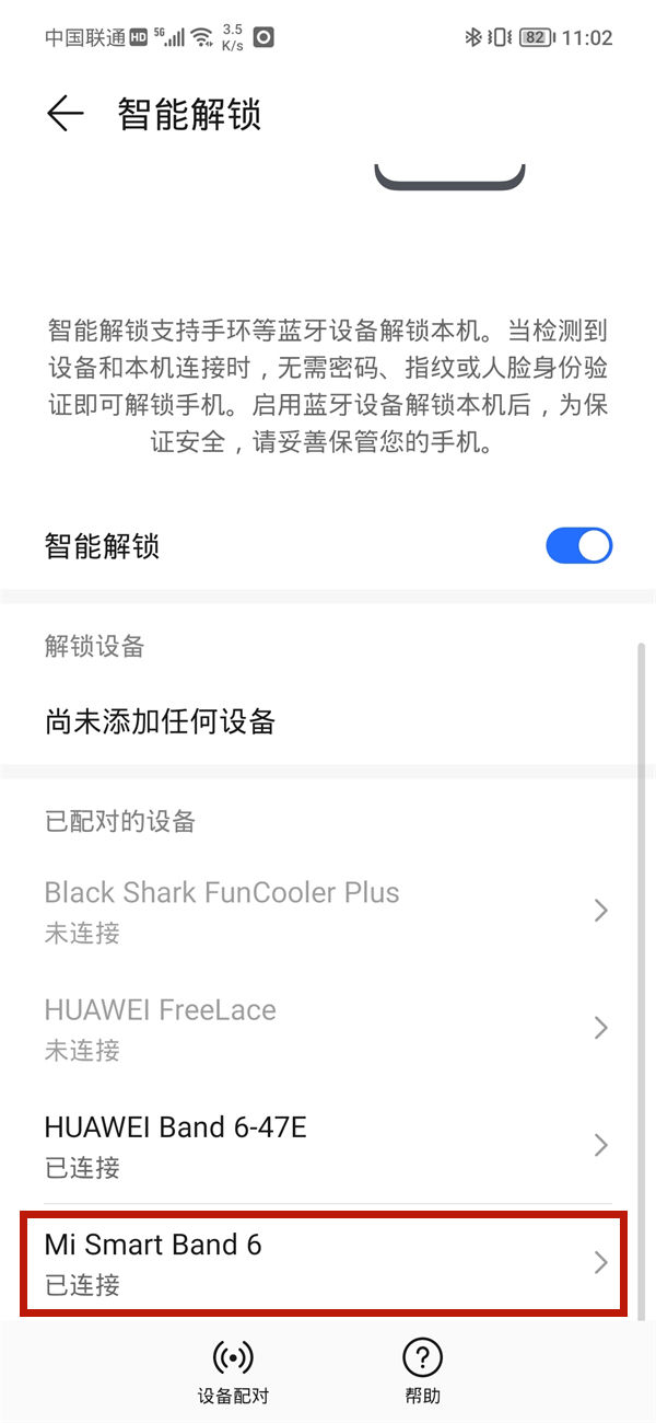 3、开启智能解锁后,连接小米手环后,手环靠近手机即可自动解锁。