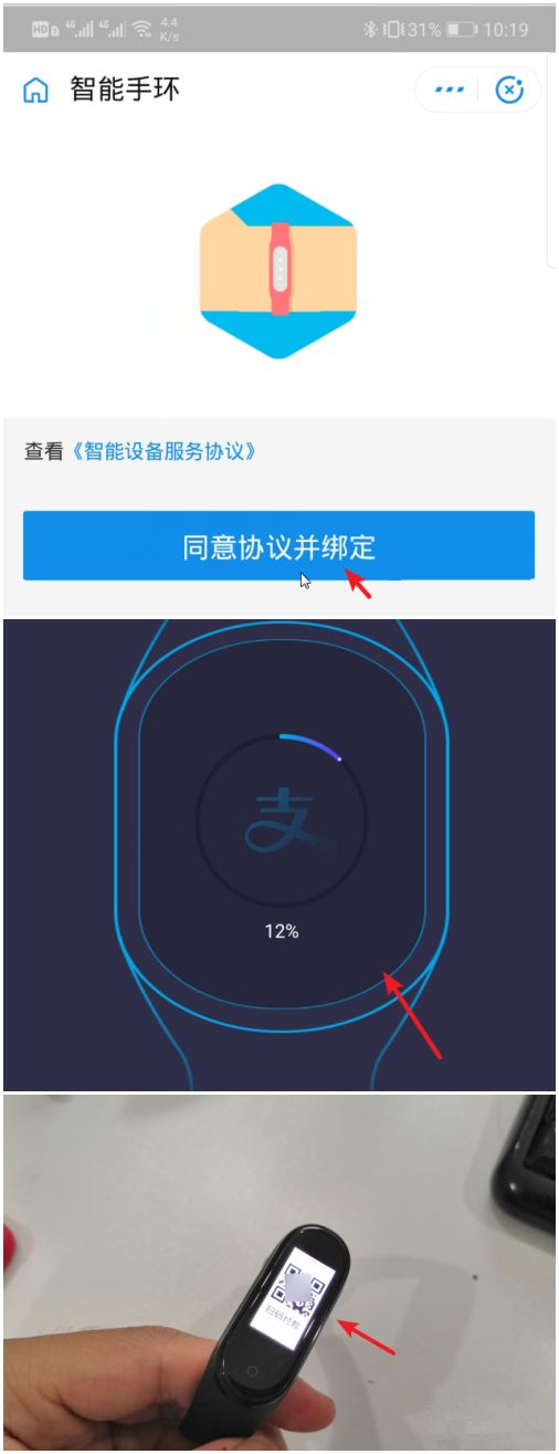 2、在手机上打开支付宝并 扫描 手环上的二维码,点击同意协议并绑定,手环就会显示正在绑定,等绑定成功后,手环上就会出现支付宝的付款码。